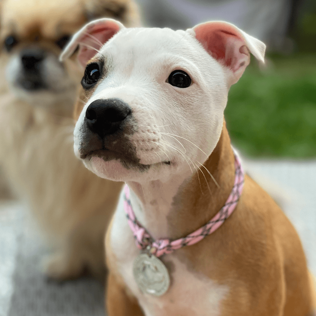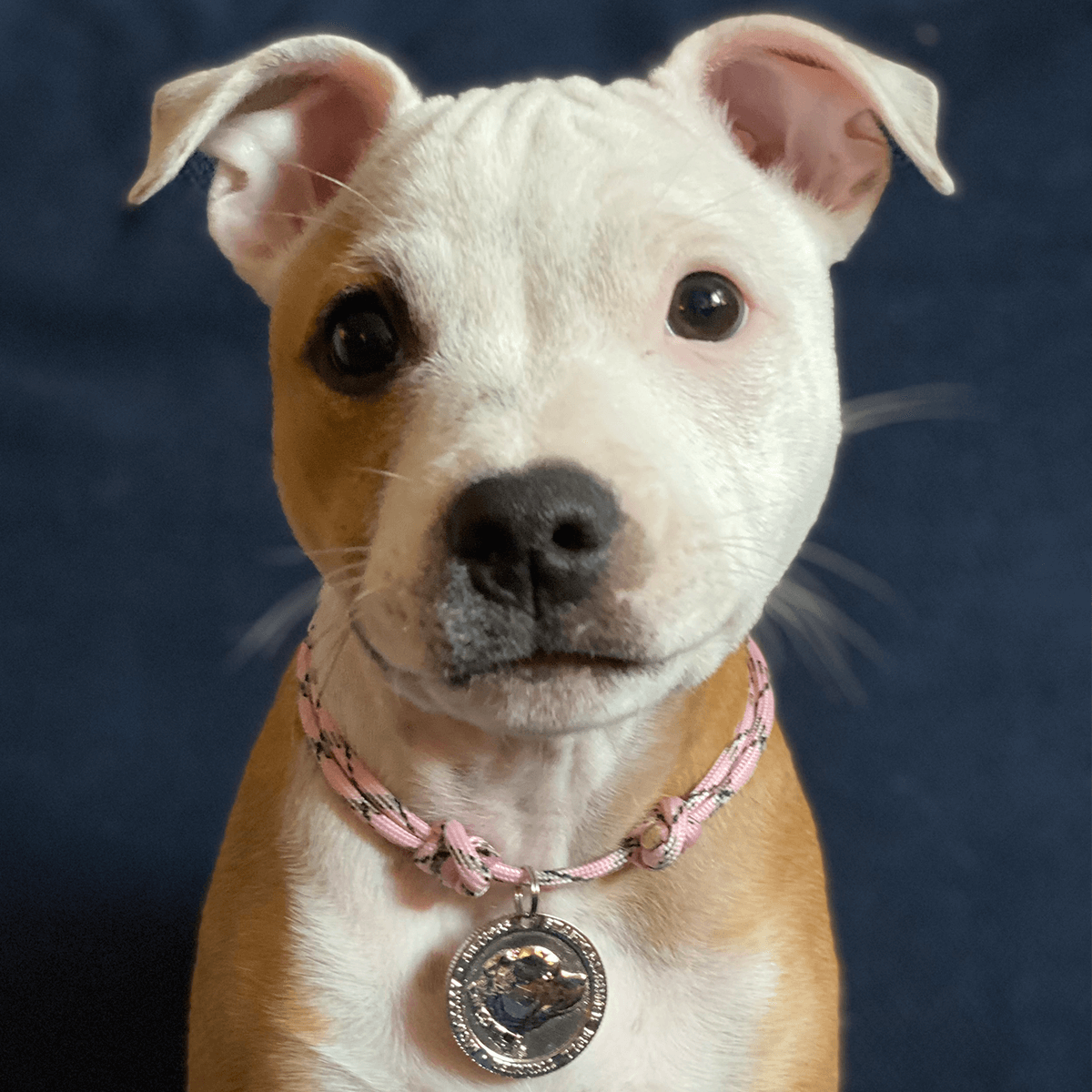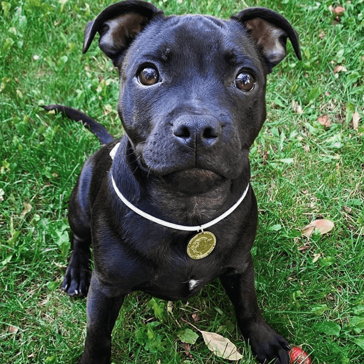 Élevez le style de votre Staffordshire Bull Terrier avec une étiquette qui allie sécurité, héritage et élégance.