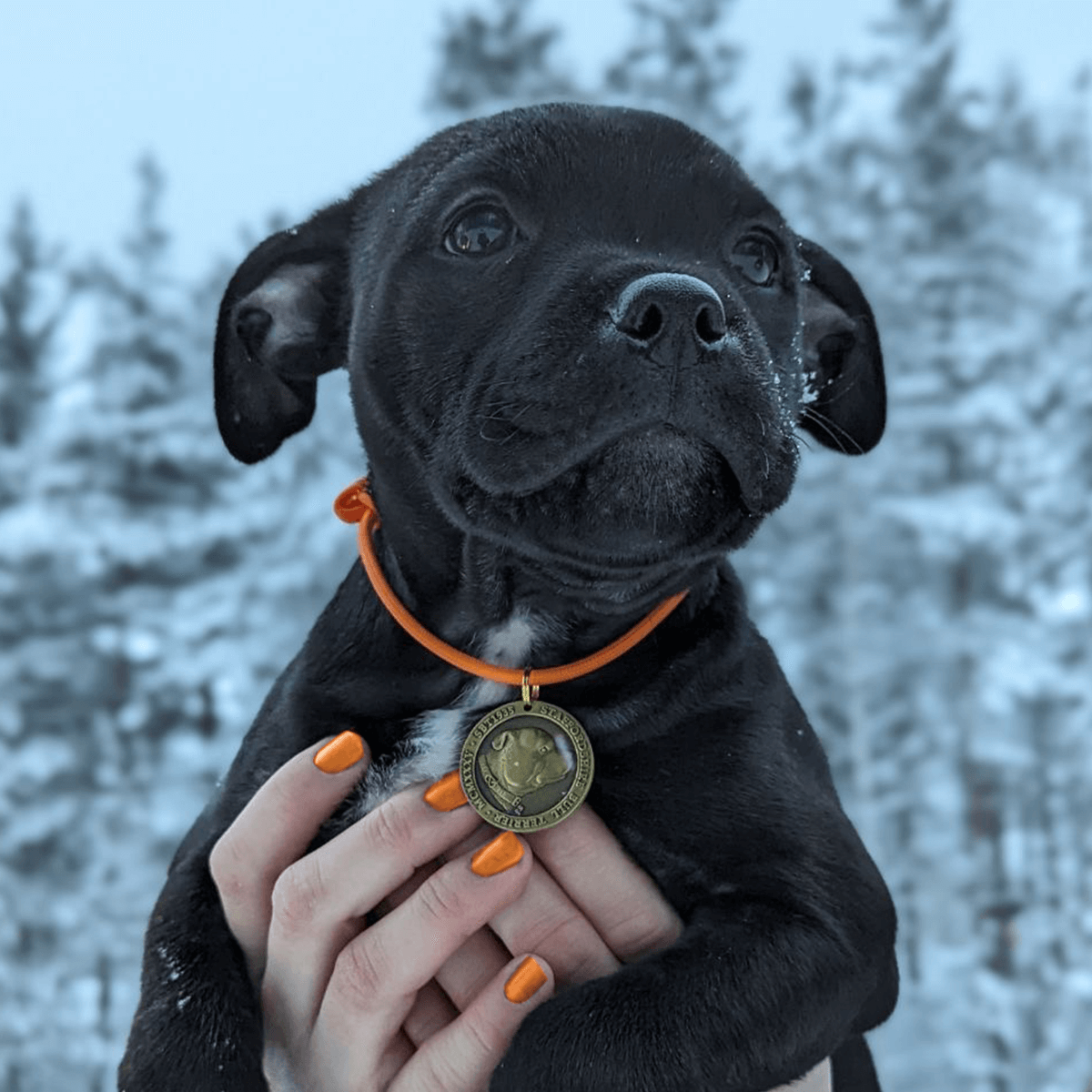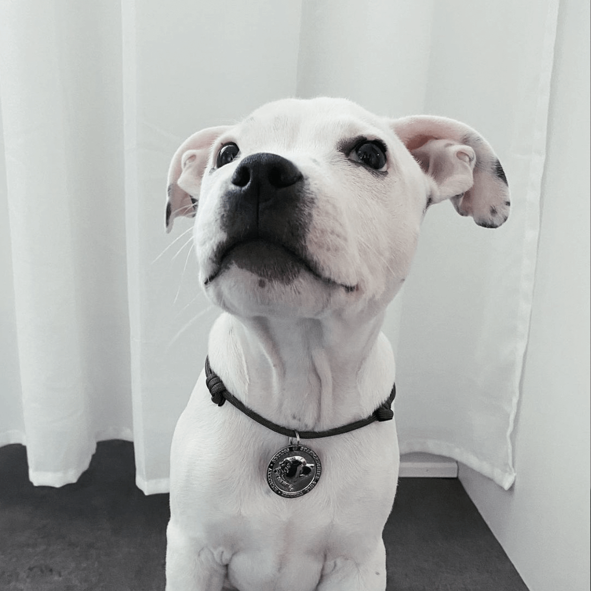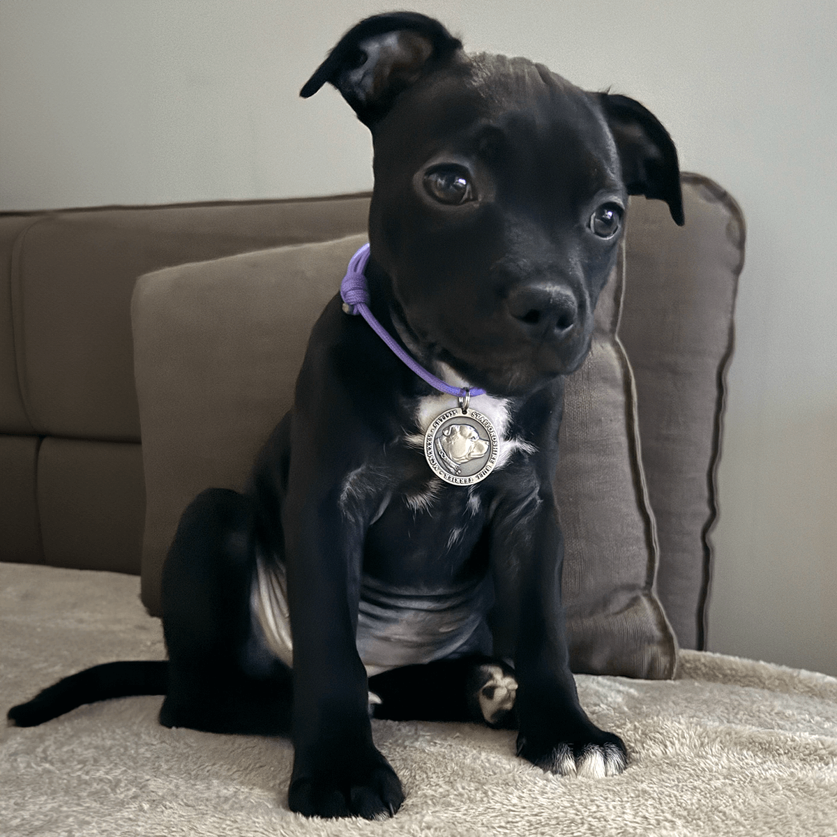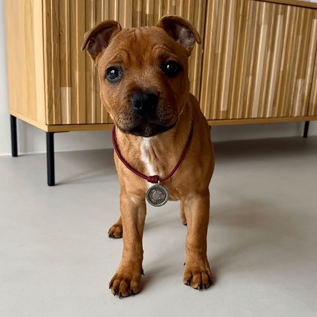 Élevez le style de votre Staffordshire Bull Terrier avec une étiquette qui allie sécurité, héritage et élégance.