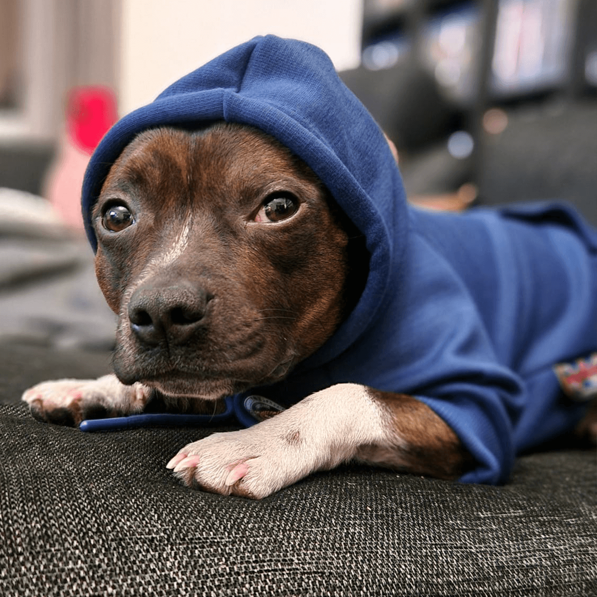 Easy to take off your staffy and also has a neck opening for our staffies with big heads