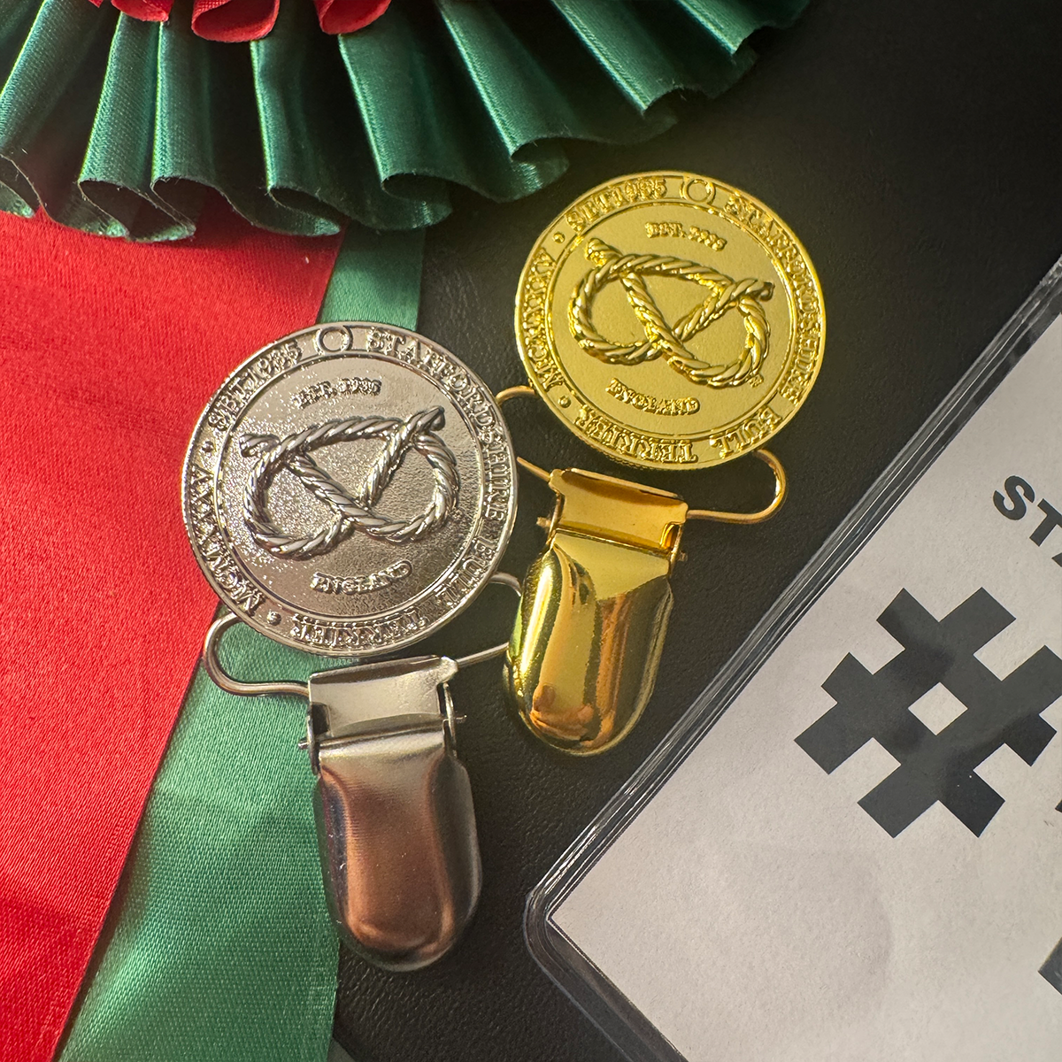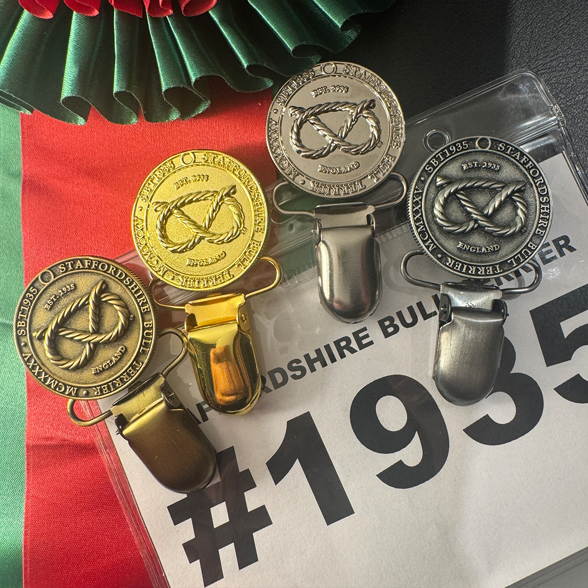 Make a statement at dog shows with our exclusive Staffordshire Bull Terrier dog show clip. Crafted in elegant gold and silver, this accessory features five distinct designs. The sturdy pin ensures secure fastening to jackets or shirts, while the convenient clip attaches effortlessly to plastic placeholders. Plus, it includes a dedicated plastic folder to display your dog’s show number. Showcase your love for Staffies with this stylish and functional clip!