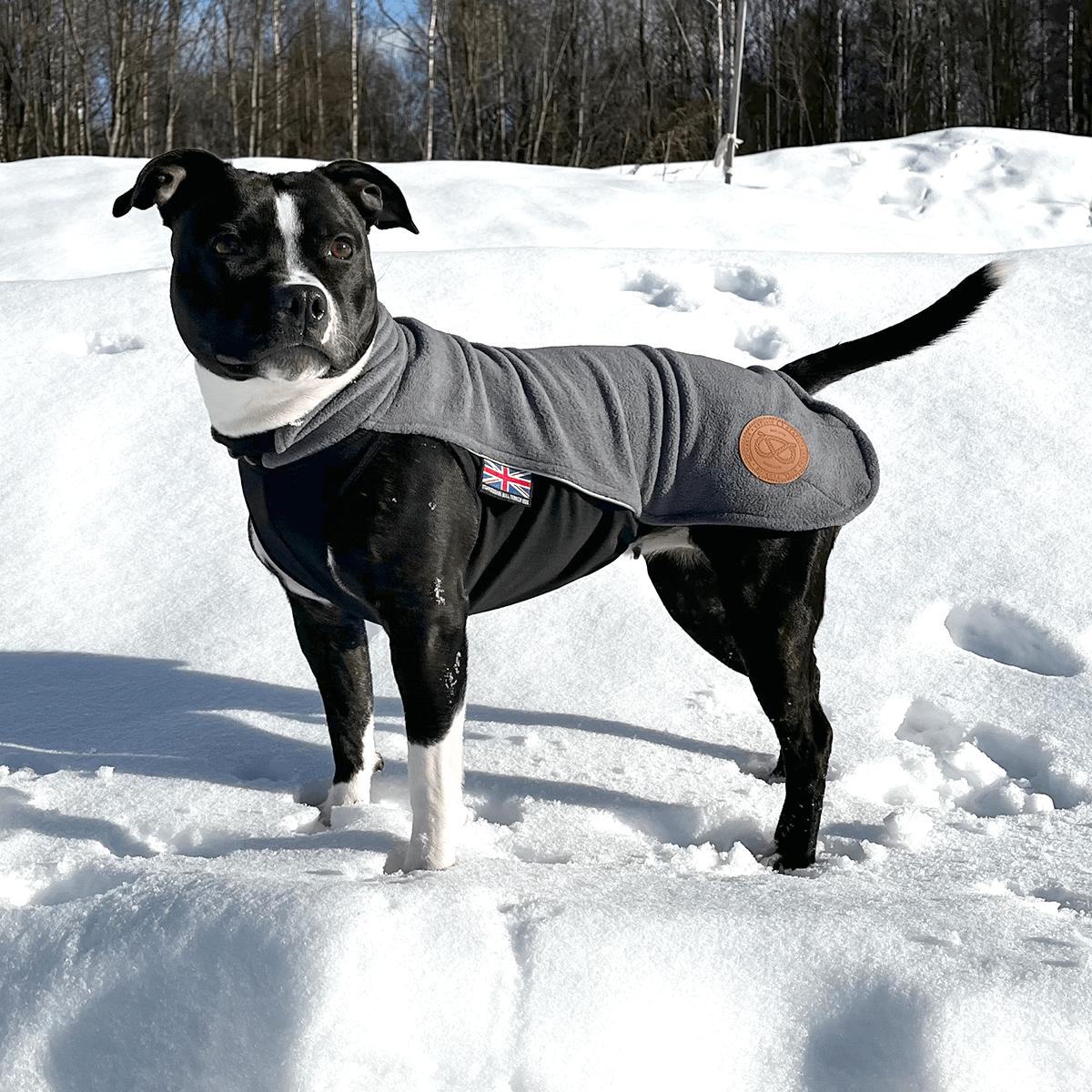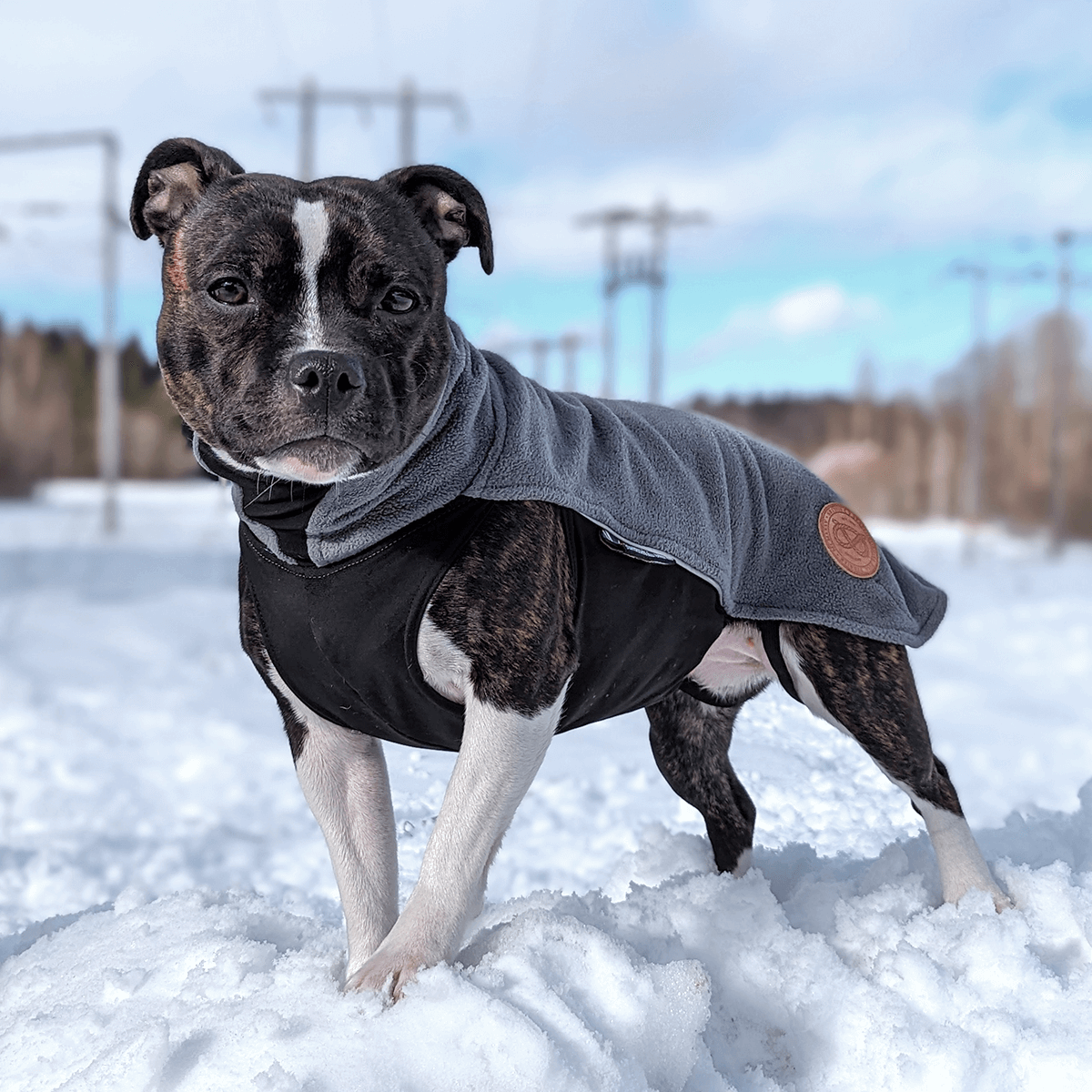 Staffordshire Bull Terrier Fleece Coat: Specially designed for Staffordshire Bull Terriers, this fleece coat is a top choice among staffy owners. With over 10.000 Staffordshire Bull Terriers worldwide enjoying its perfect fit and superior comfort, this staffy fleece coat is a must-have. Keep your staffy stylish and cozy all year round with this premium coat, tailored exclusively for Staffordshire Bull Terriers special body type, short and stocky.