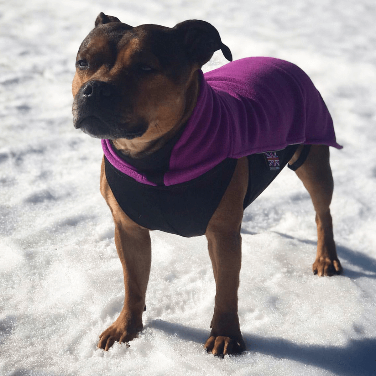 The staffy fleece coat is such a big success as its a dog coat with a perfect fit for our beloved short and stocky staffies. The magic formula to make it a staffy success: It's easy to wash, flexible and elastic warm cozy fleece material, adjustable leg straps to prevent coat from rolling up, reflective strips on both sides to be visible for traffic and branded with the heritage stafford knot and Union Jack flag.