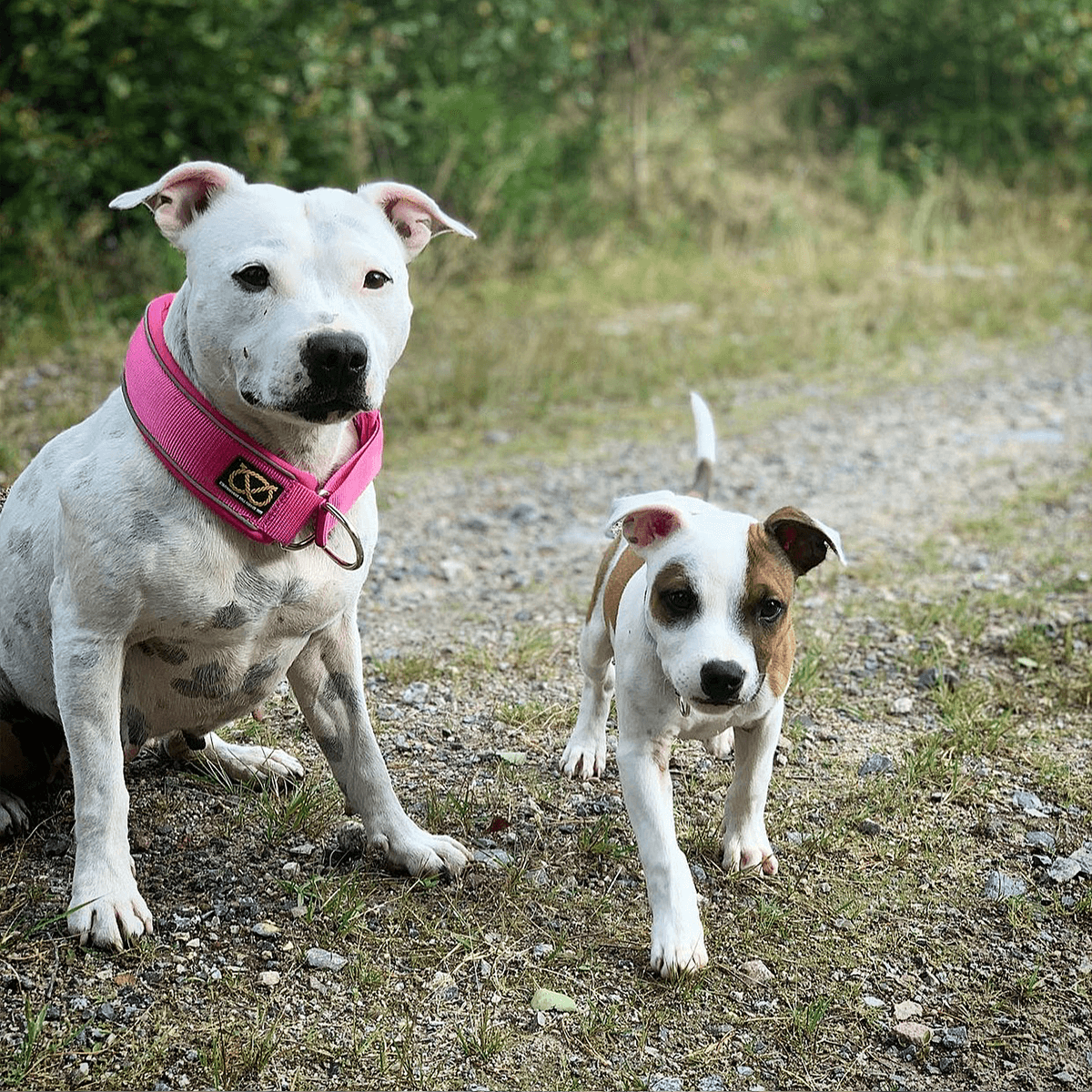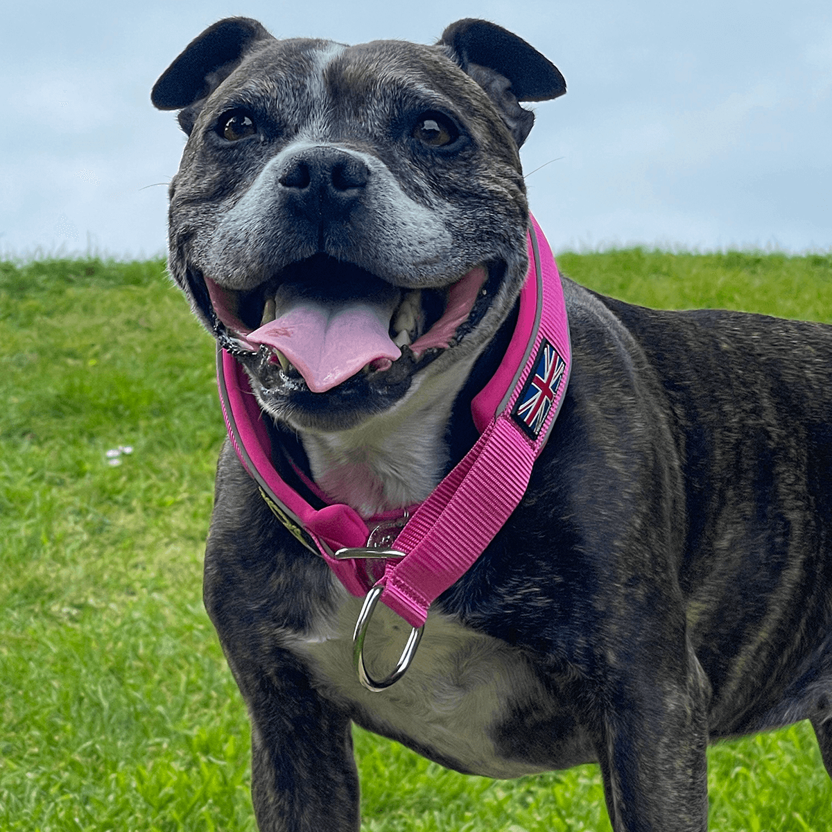 The Staffy Martingale Collar, also known as a half choke collar, is a trusted choice for over Staffordshire Bull Terrier owners worldwide. Crafted with care, this collar strikes a balance between functionality and comfort.