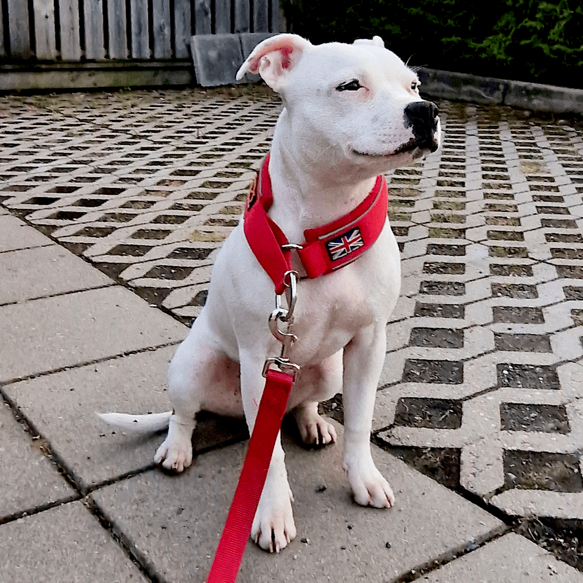 The Staffy Martingale Collar, also known as a half choke collar, is a trusted choice for over Staffordshire Bull Terrier owners worldwide. Crafted with care, this collar strikes a balance between functionality and comfort.