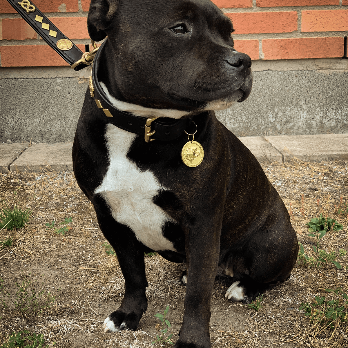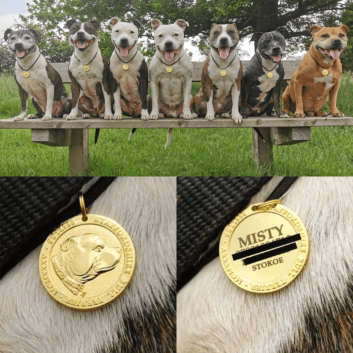 Elevate your Staffordshire Bull Terrier’s style with a nametag that blends safety, heritage, and elegance.