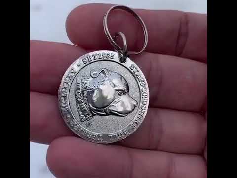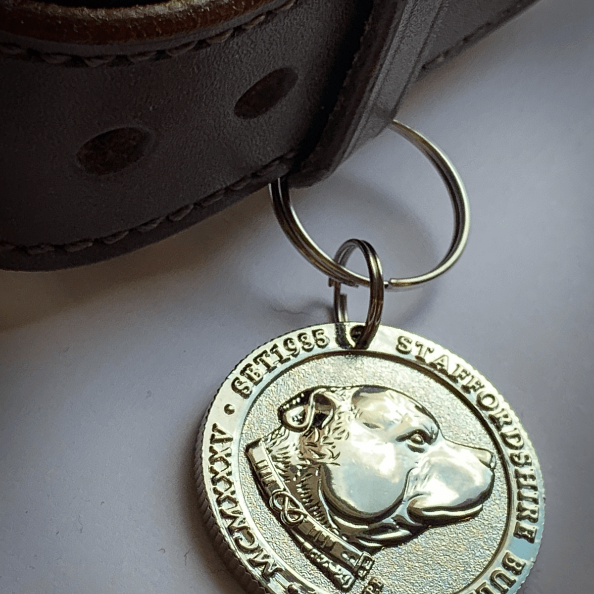 A: With a diameter of 32 mm and a thickness of 2 mm, the nametag is an ideal size for Staffordshire Bull Terriers. It’s also adorned with a Staffie collar and the Stafford knot emblem, celebrating the breed’s distinctive features.