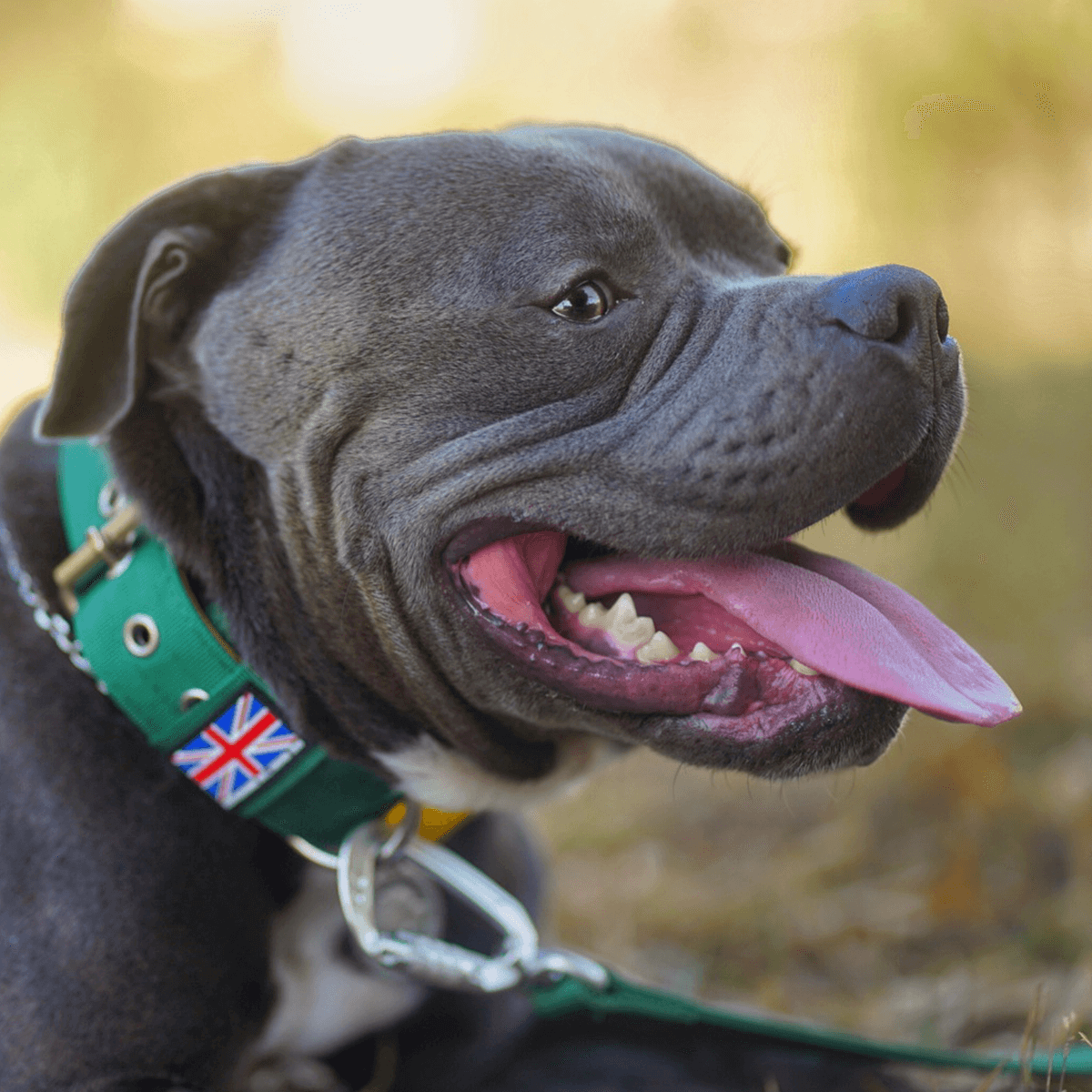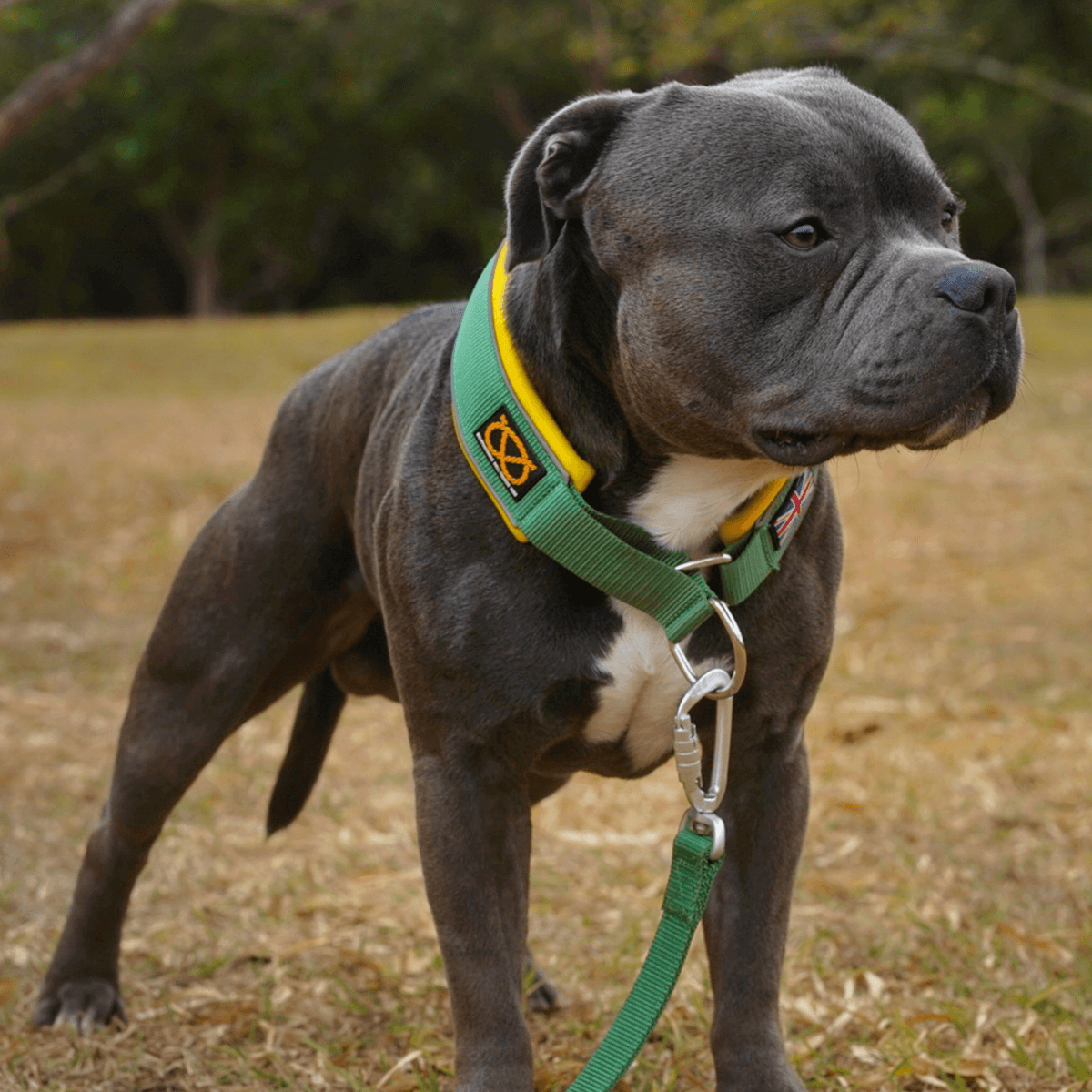 A: Remarkably lightweight yet astonishingly robust, it’s designed to withstand the formidable strength of a Staffordshire Bull Terrier.