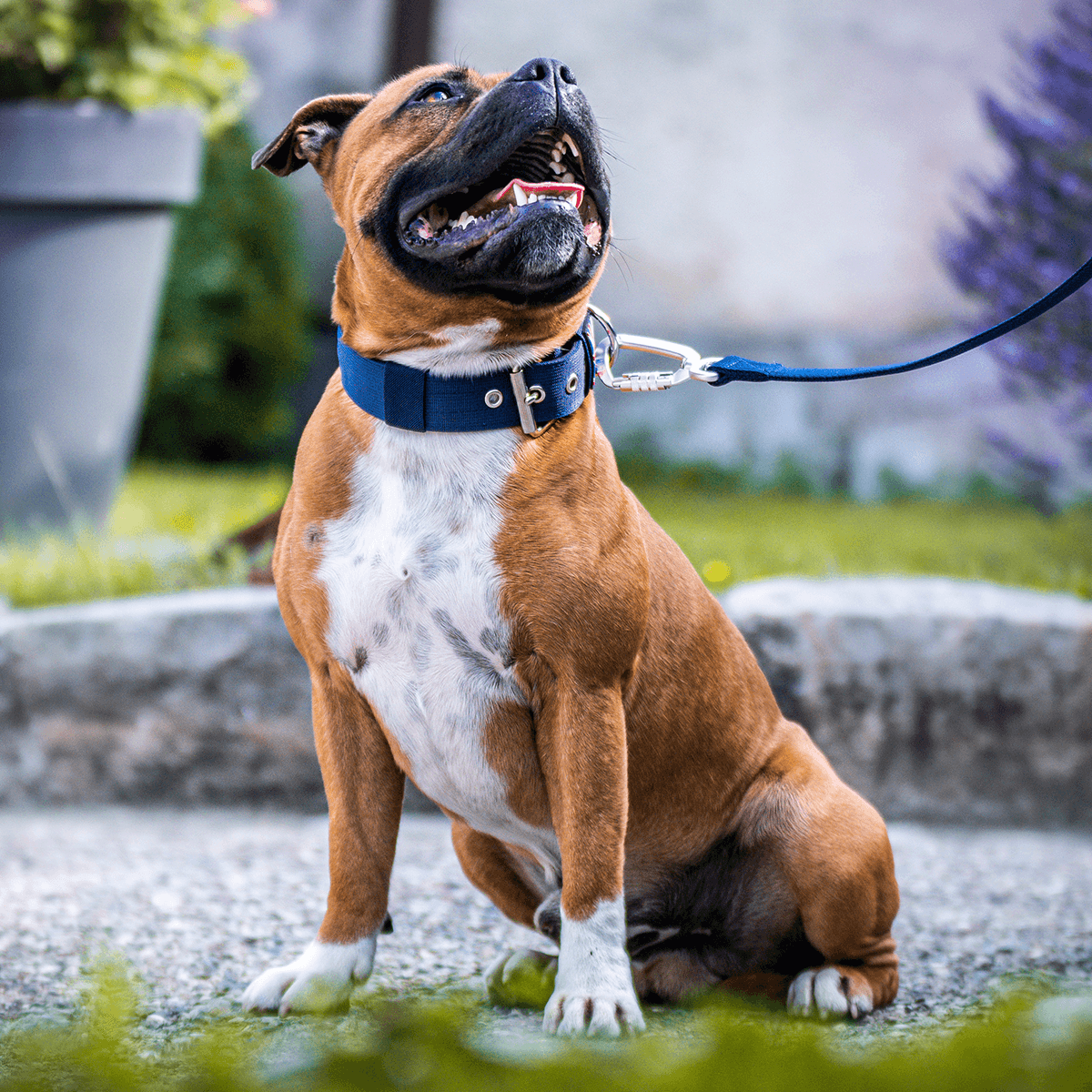 A: Remarkably lightweight yet astonishingly robust, it’s designed to withstand the formidable strength of a Staffordshire Bull Terrier.