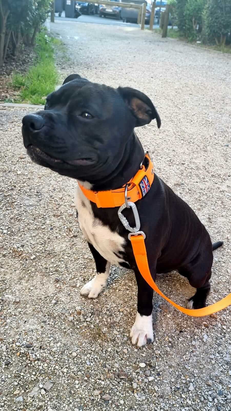 A: Remarkably lightweight yet astonishingly robust, it’s designed to withstand the formidable strength of a Staffordshire Bull Terrier.
