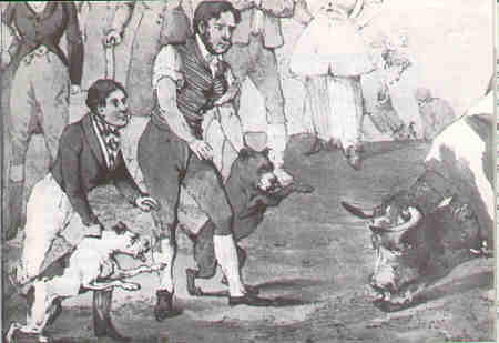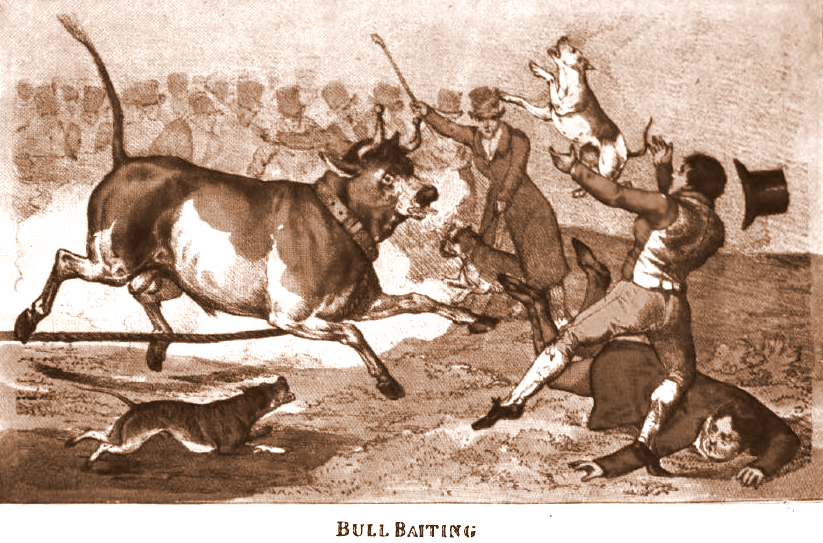 "Från att vara en kämpe till att bli den älskade nanny dog" - Före 1800-talet var det väldigt vanligt att människor oavsett vilken grupp av samhället de tillhör deltog i att titta på blodsporter som tjurbete, björnbete och tuppfäktning. Tjurar som släpptes ut på marknaden anträffades av hundar som mycket liknade Staffordshire Bull Terrier. Det gjordes som ett sätt att möra köttet och ge underhållning åt åskådarna; och hundslagsmål med björnar, tjurar och andra djur organiserades ofta som underhållning för både kungligheter och allmoge.