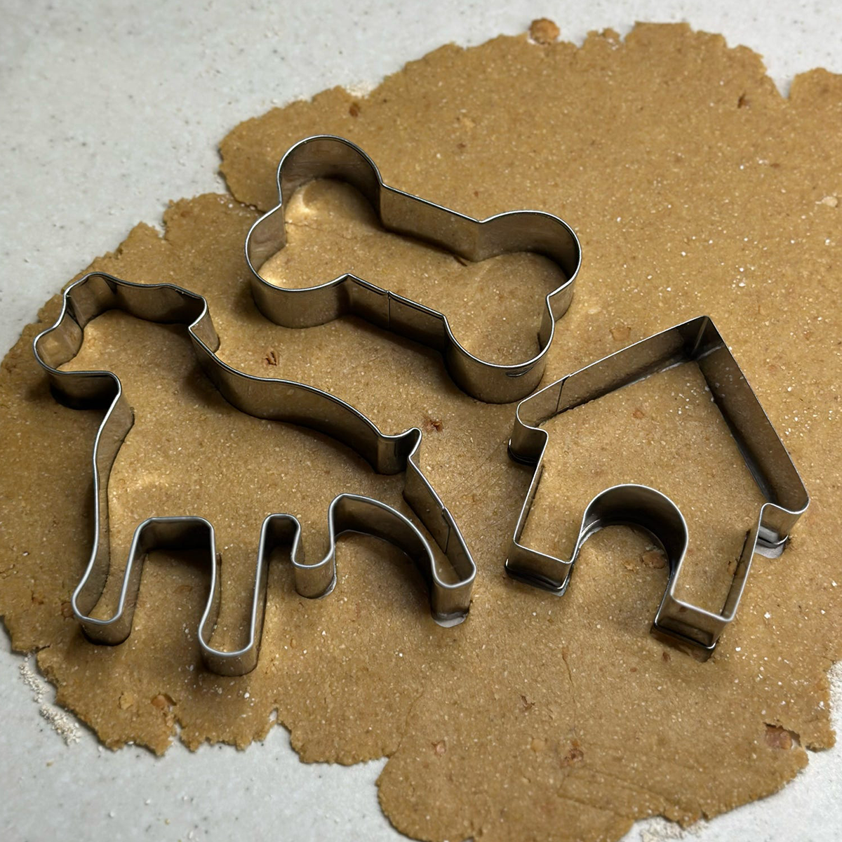 S: Setet innehåller tre olika kakformar: en staffe-siluett, en hundkoja och ett hundben.