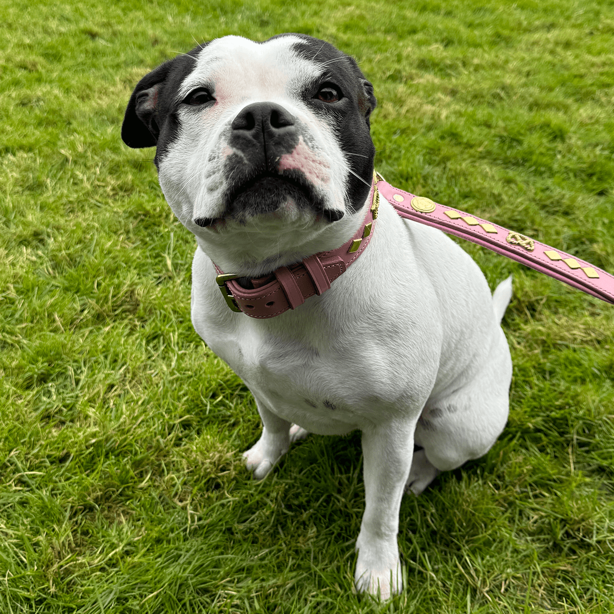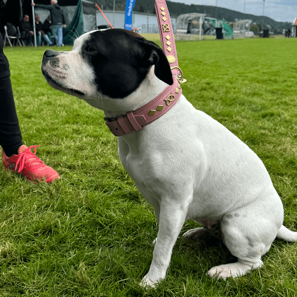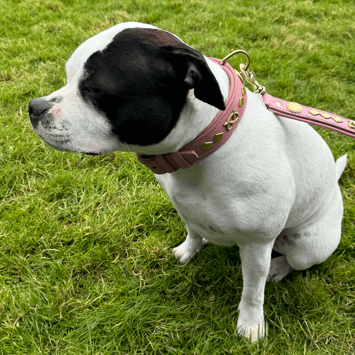 Staffordshire Bull Terrier 1935® Läderhalsband & Koppel Set - Gentleman Jim - Babyrosa/Guld