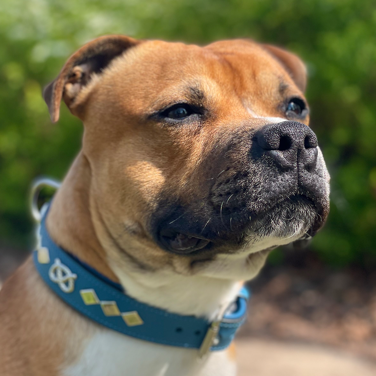 Ge din Staffordshire Bullterrier ett läderhalsband och läderkoppel som återspeglar deras styrka, elegans och historia.
