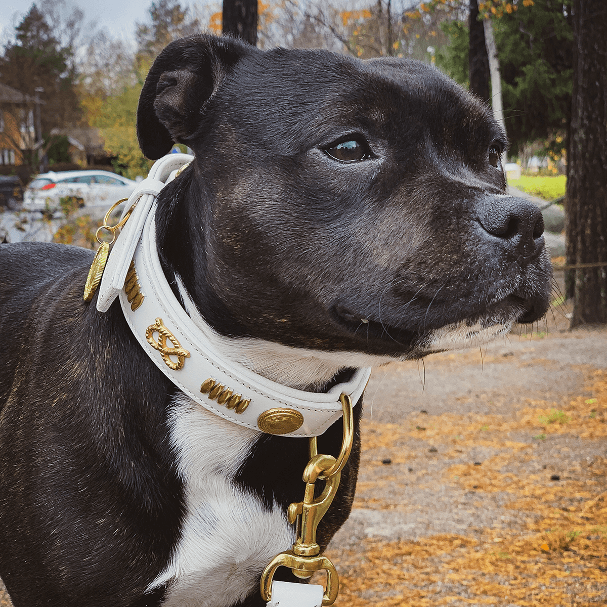 Staffordshire Bull Terrier 1935® Läderhalsband & Koppel Set - Gladiator - Vit/Guld