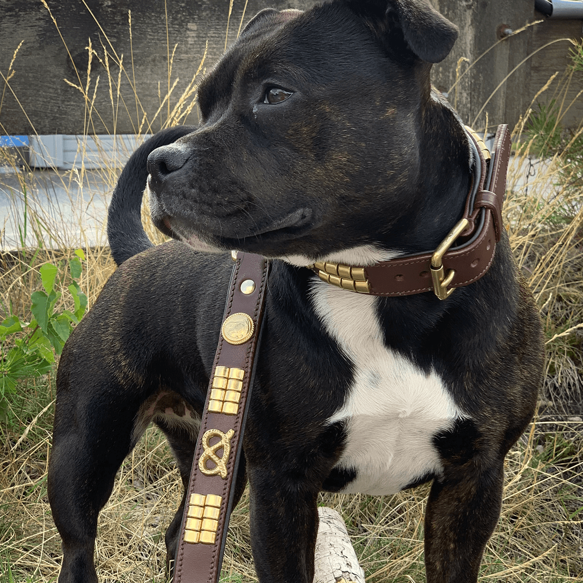Ge din Staffordshire Bullterrier ett läderhalsband och läderkoppel som återspeglar deras styrka, elegans och historia.