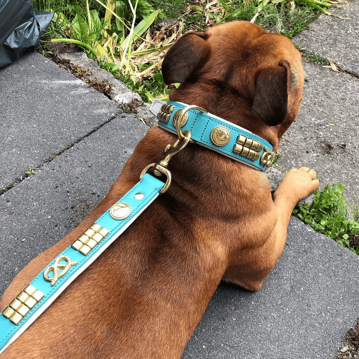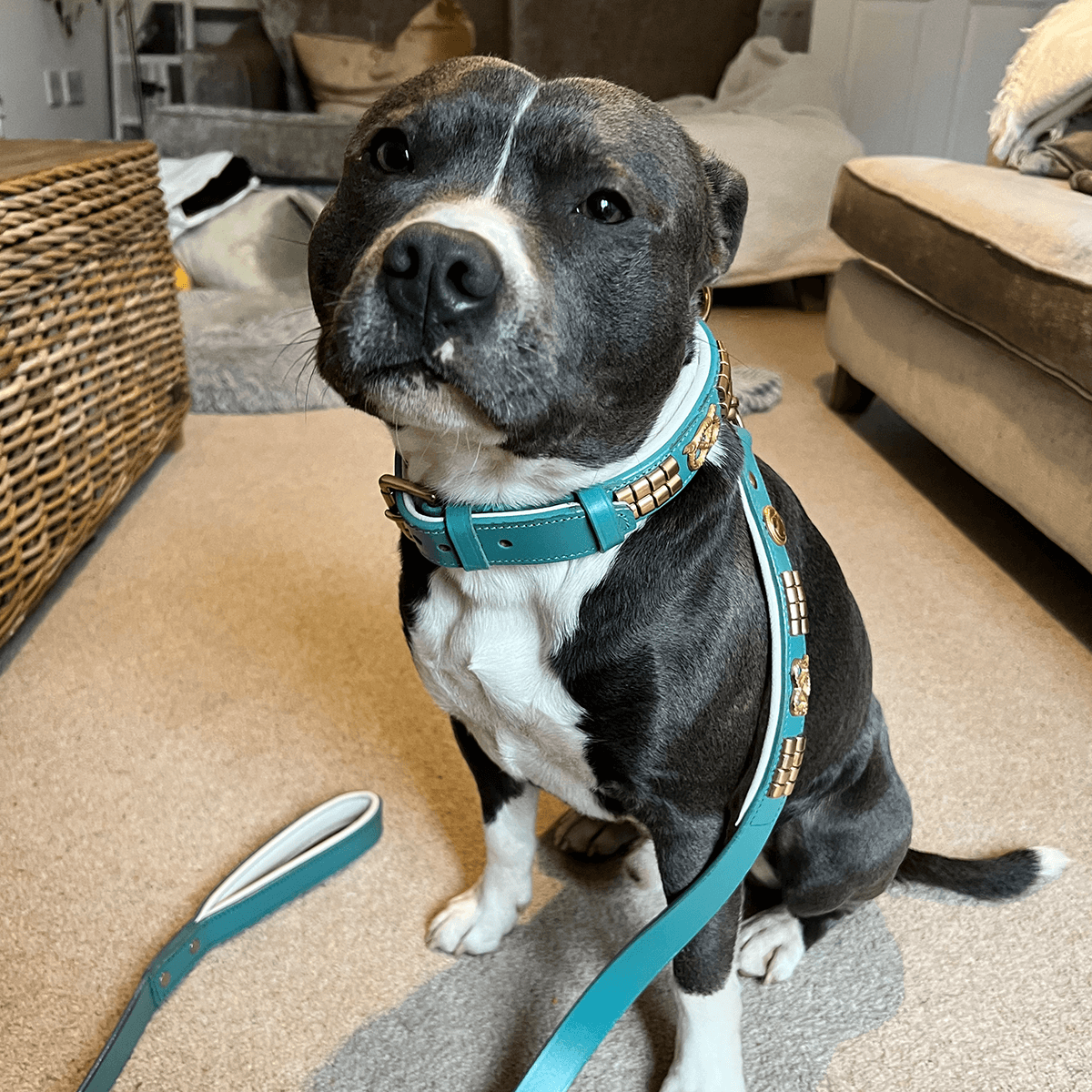 Staffordshire Bull Terrier 1935® Läderhalsband & Koppel Set - Jefferson - Turkos/guld