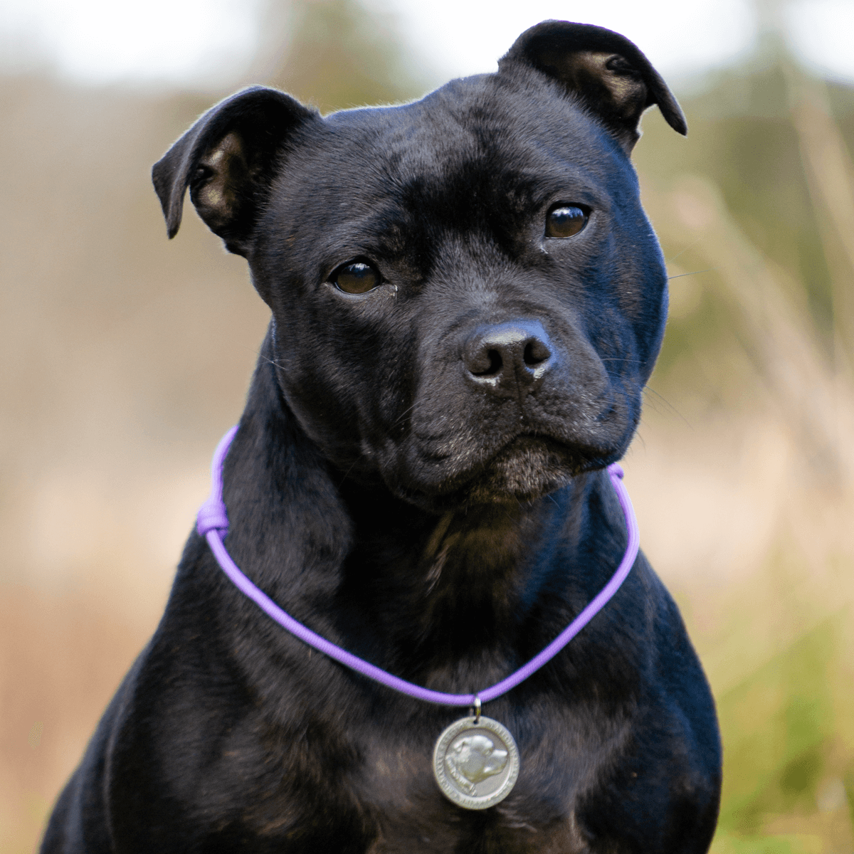 S: Med en diameter på 32 mm och en tjocklek på 3 mm är namnbrickan en idealisk storlek för Staffordshire Bullterrier. Den är också prydd med en staffie-halsband och stafford-knuten, som hyllar rasens historia och arv.