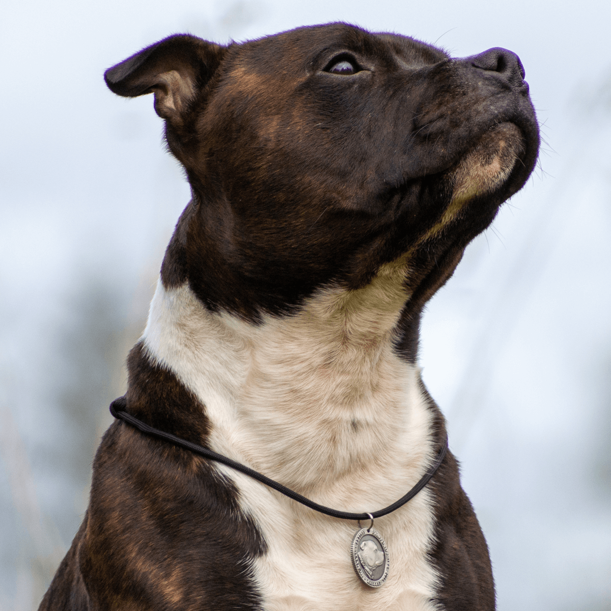 Lyft upp din Staffordshire Bullterriers stil med en staffe namnbricka som kombinerar säkerhet, arv och elegans.