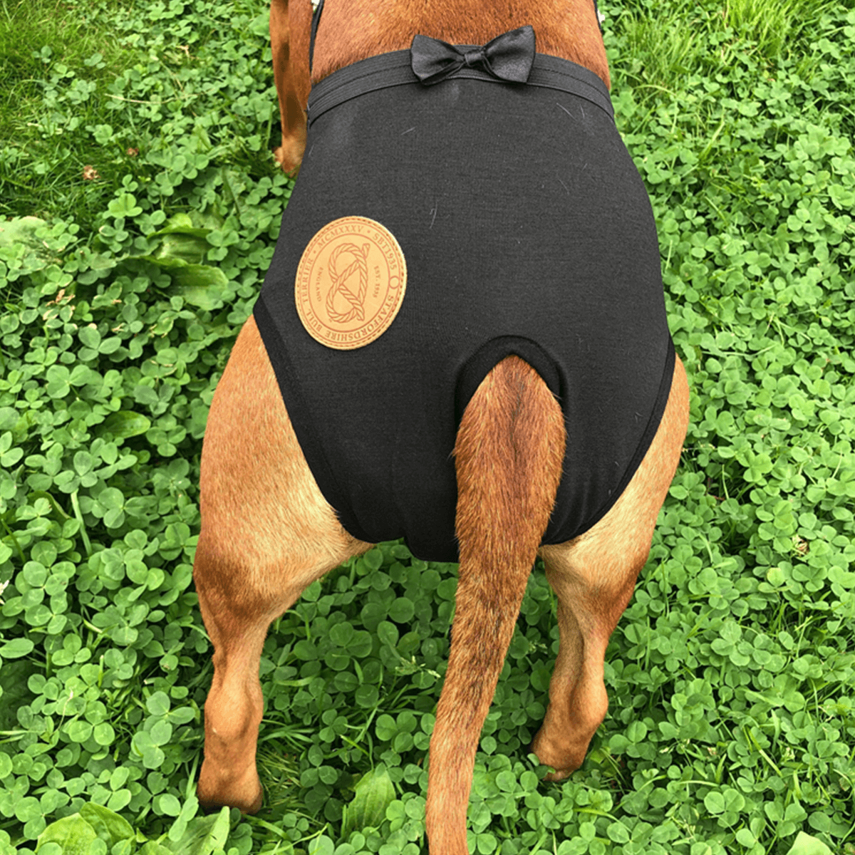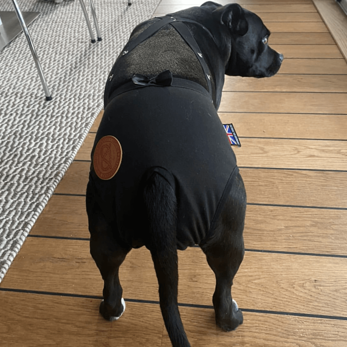 Staffordshire Bullterrier tikskydd med hängslen! - skräddarsydd tiktrosa för att passa Staffordshire Bullterrier under löpet, nu även med åtstramning i midjan som gör att dessa staffe tiktrosor inte åker av och gör löpet lite lättare!