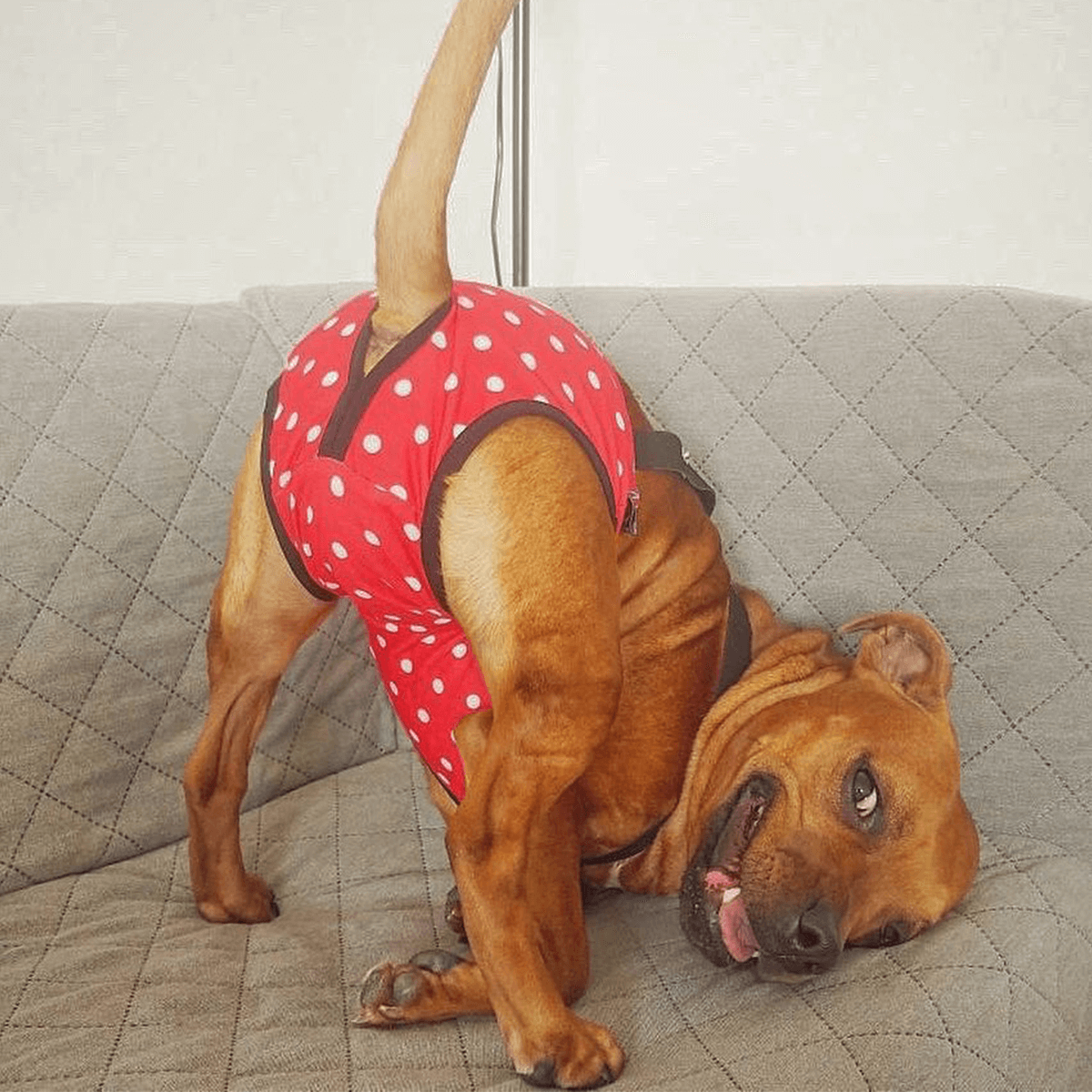 Staffordshire Bullterrier tikskydd med hängslen! - skräddarsydd tiktrosa för att passa Staffordshire Bullterrier under löpet, nu även med åtstramning i midjan som gör att dessa staffe tiktrosor inte åker av och gör löpet lite lättare!