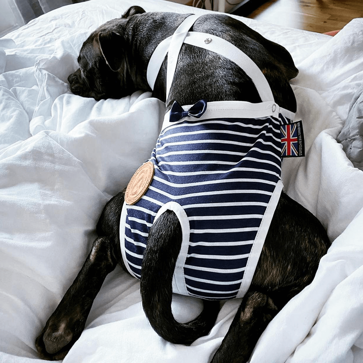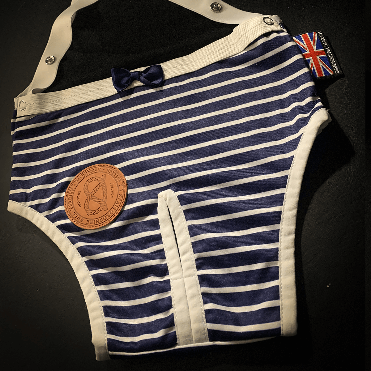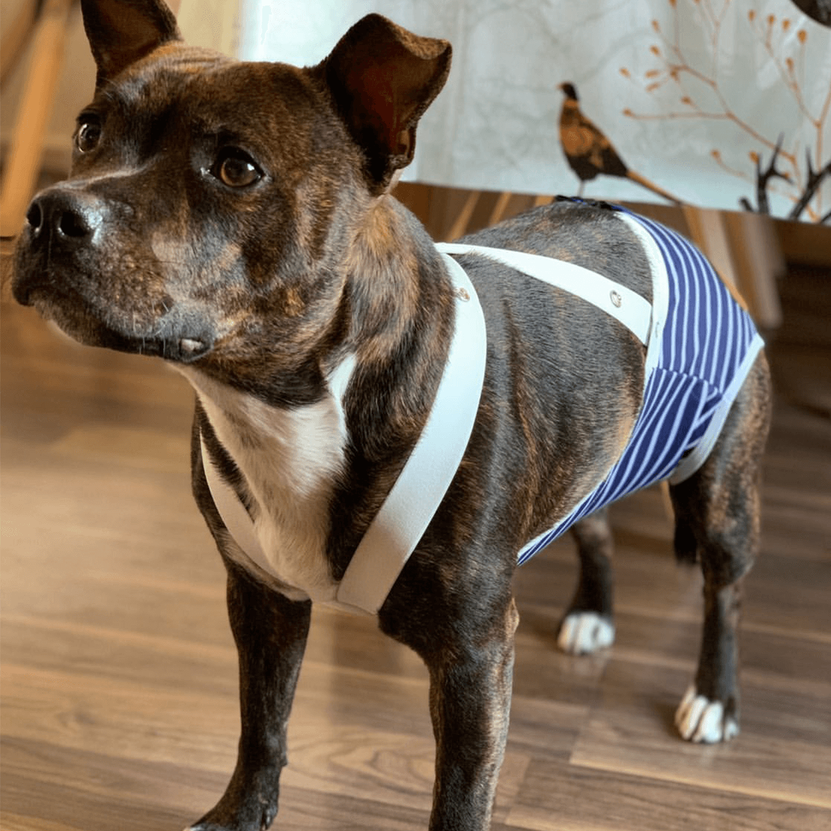 Staffordshire Bullterrier tikskydd med hängslen! - skräddarsydd tiktrosa för att passa Staffordshire Bullterrier under löpet, nu även med åtstramning i midjan som gör att dessa staffe tiktrosor inte åker av och gör löpet lite lättare!