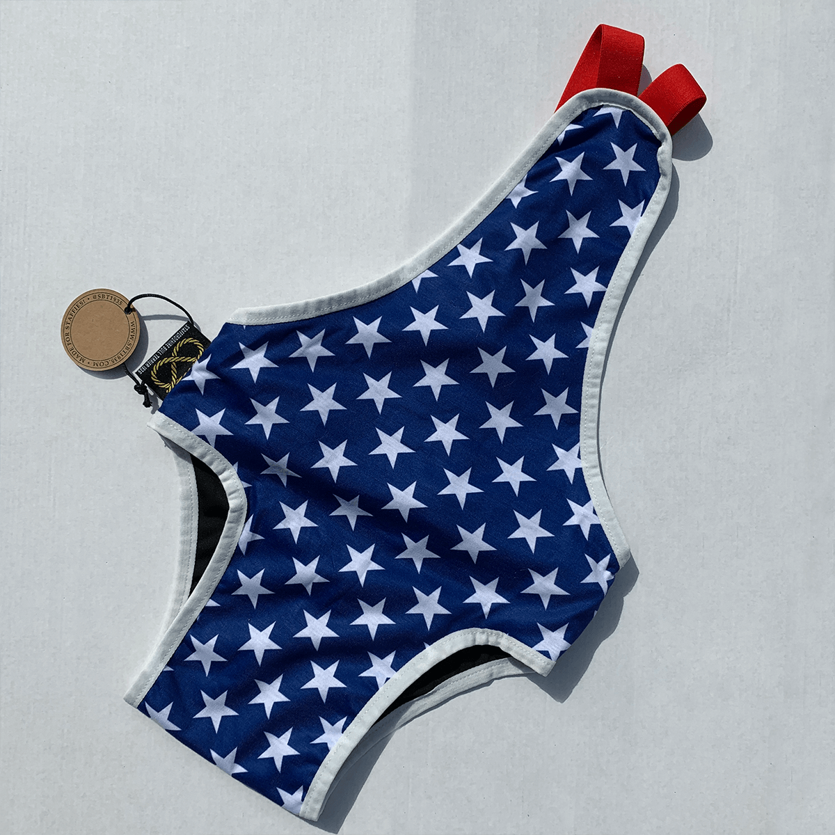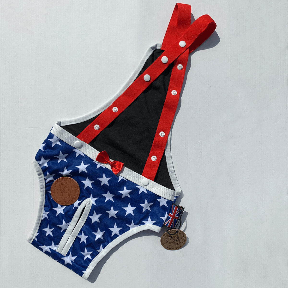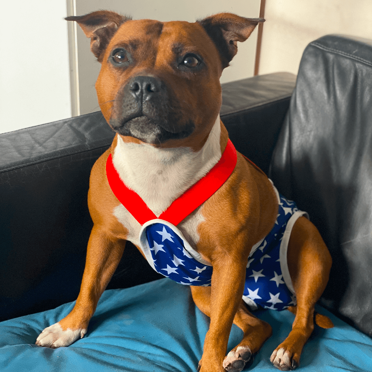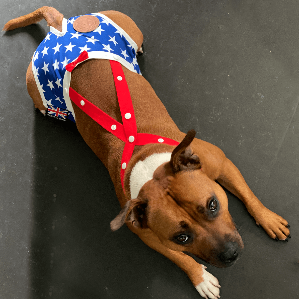 Staffordshire Bullterrier tikskydd med hängslen! - skräddarsydd tiktrosa för att passa Staffordshire Bullterrier under löpet, nu även med åtstramning i midjan som gör att dessa staffe tiktrosor inte åker av och gör löpet lite lättare!