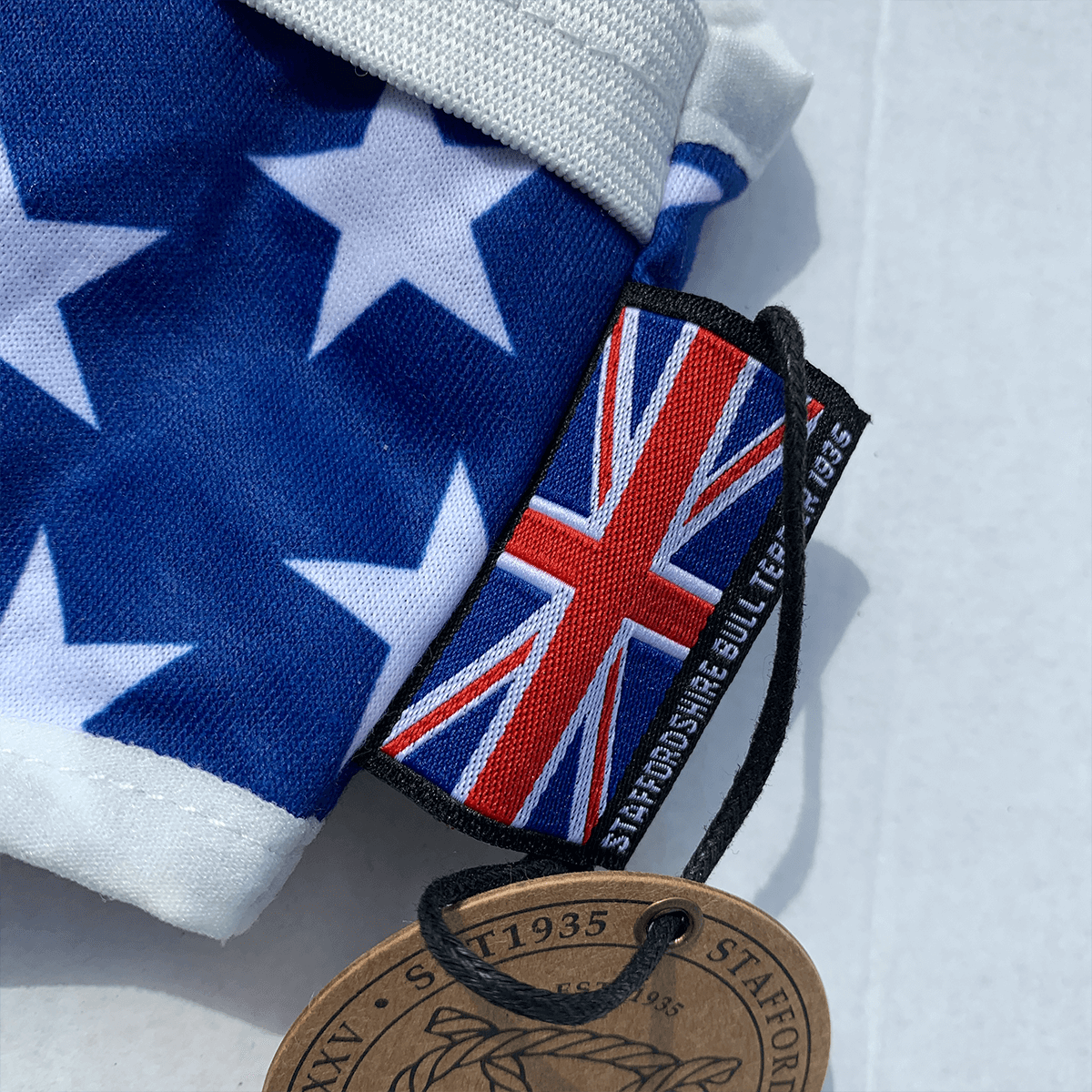 Staffordshire Bull Terrier tikskydd med hängslen är gjorda av högkvalitativt polyesterjerseymaterial.