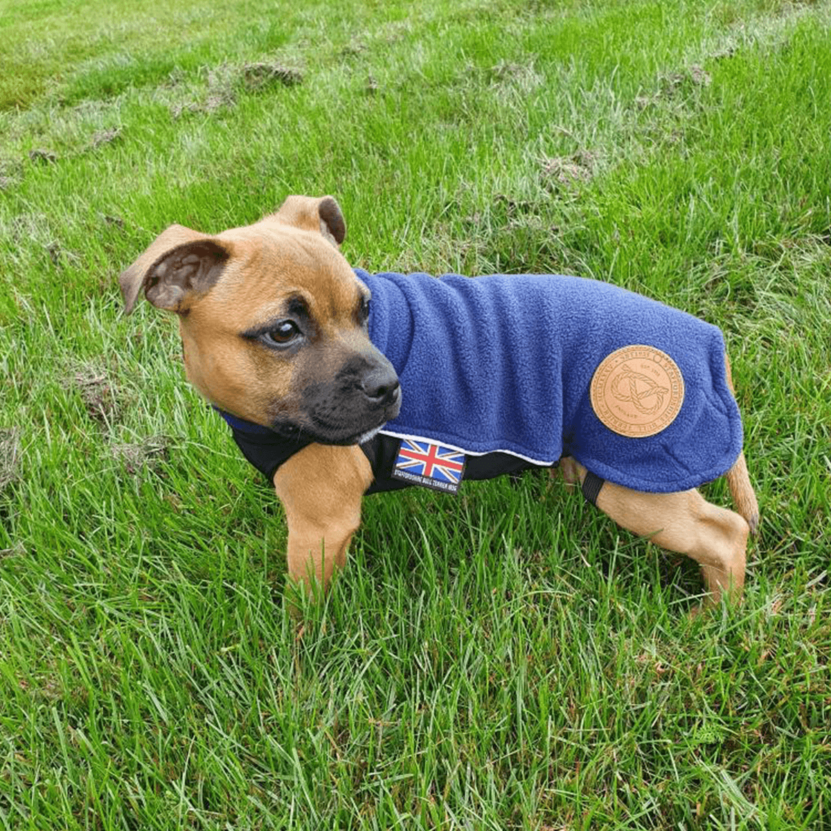 Staffordshire Bullterrier fleecetäcket har justerbara benband som förhindrar att täcket rullar upp sig på baken, reflexremsor på båda sidorna för bra synlighet i mörker, samt är stilfullt märkt med Union Jack-flaggan och den ikoniska Stafford-knuten.