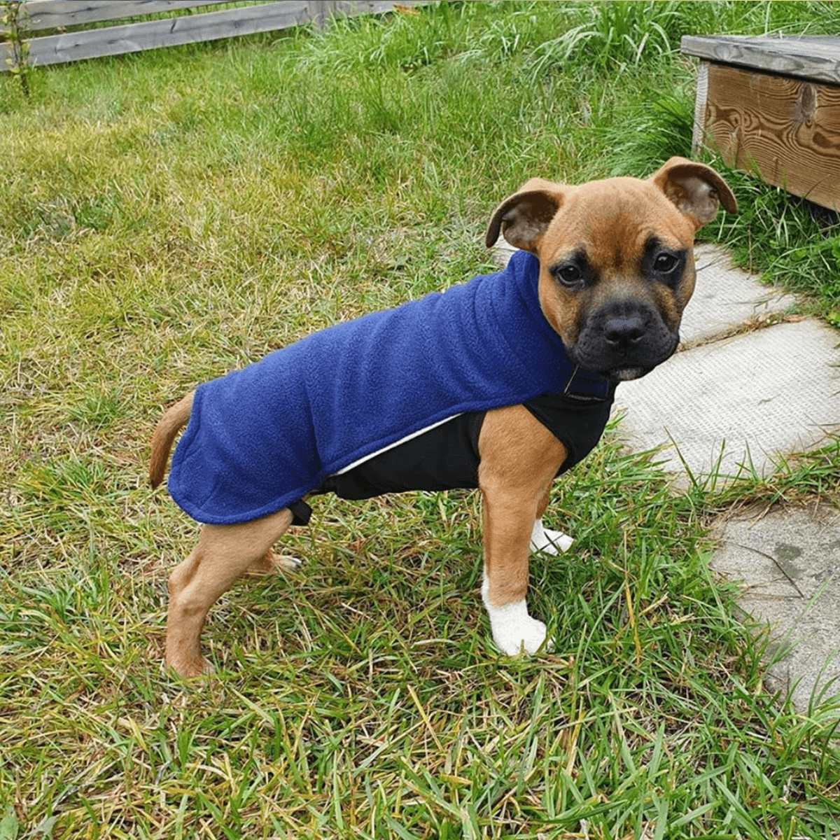 Fleecetäcket ger din Staffordshire Bullterrier skydd mot vind och kyla, samtidigt som det låter din staffordshire bullterrier röra sig naturligt och flexibelt. Detta täcke fungerar utmärkt under större delen av året, oavsett om det är kalla sommarnätter, tidiga höstmorgnar, regniga vårdagar eller under vintersäsongen. Detta är ett täcke som en staffe faktiskt kan ha på sig utan att de vägrar att gå och bara står stilla som med många andra tjockare vintertäcken.