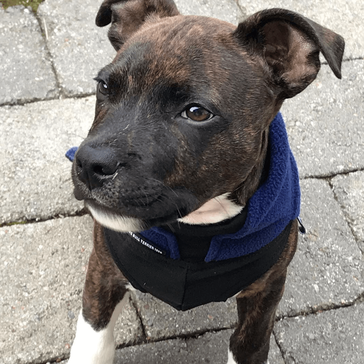 S: Detta staffordshire bullterrier-valp fleecetäcke är skräddarsytt för passa just staffar och dess speciella koppsbyggnad. Det är just därför det är populärt och används av över 10000 staffar världen över. Därtill så ger fleecetäcket ger värme, flexibilitet och komfort.