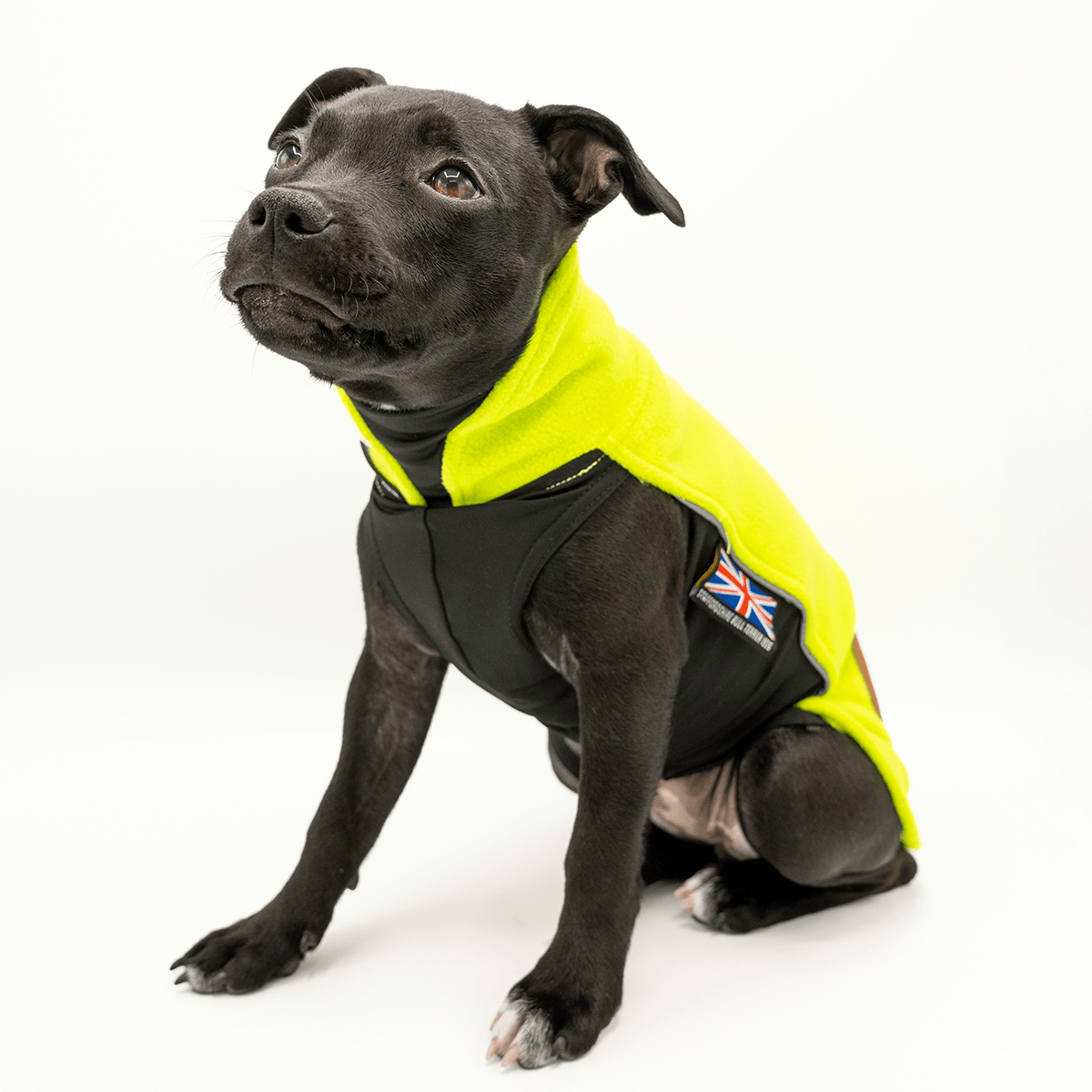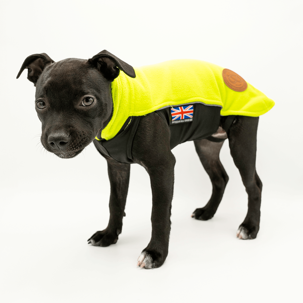 Staffordshire Bullterrier fleecetäcket har justerbara benband som förhindrar att täcket rullar upp sig på baken, reflexremsor på båda sidorna för bra synlighet i mörker, samt är stilfullt märkt med Union Jack-flaggan och den ikoniska Stafford-knuten.
