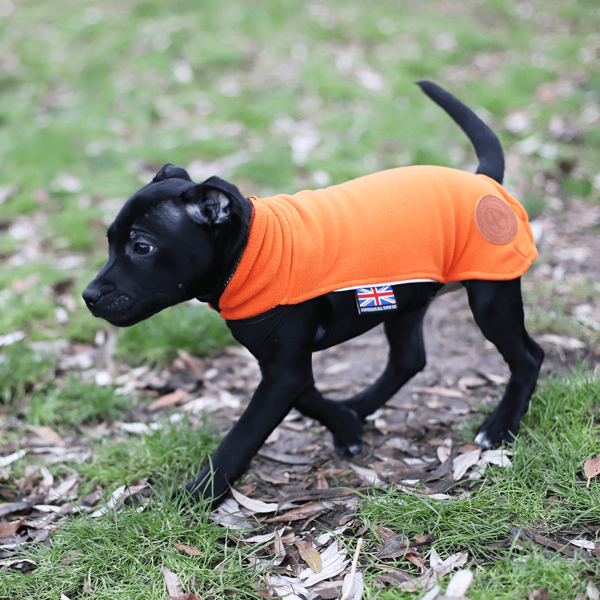 Staffordshire Bullterrier fleecetäcket har justerbara benband som förhindrar att täcket rullar upp sig på baken, reflexremsor på båda sidorna för bra synlighet i mörker, samt är stilfullt märkt med Union Jack-flaggan och den ikoniska Stafford-knuten.