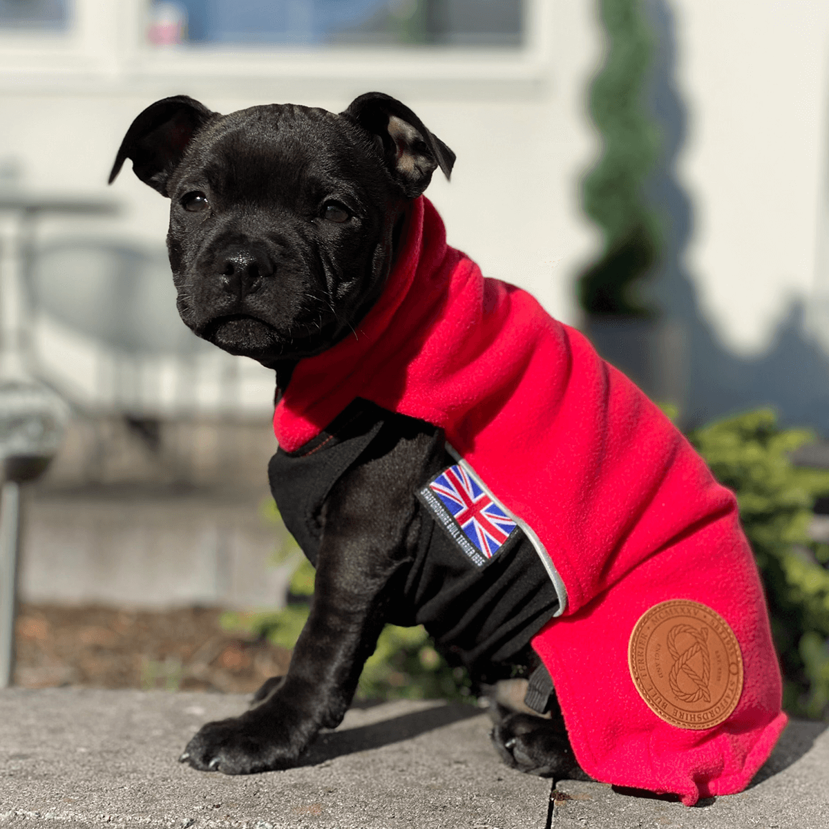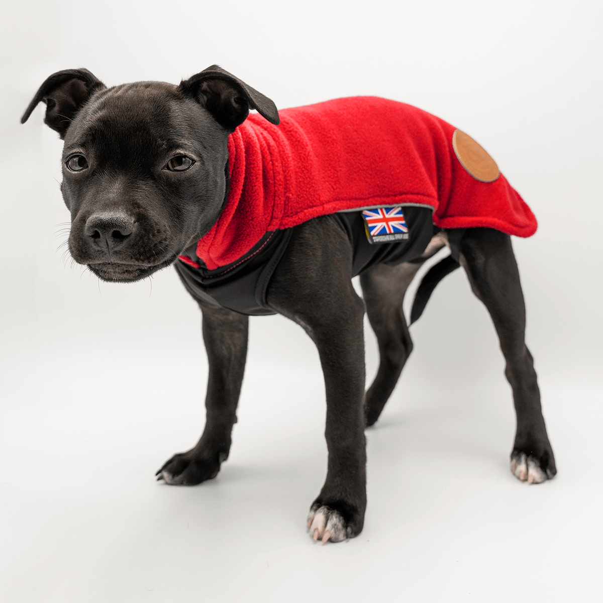 Staffordshire Bullterrier fleecetäcket har justerbara benband som förhindrar att täcket rullar upp sig på baken, reflexremsor på båda sidorna för bra synlighet i mörker, samt är stilfullt märkt med Union Jack-flaggan och den ikoniska Stafford-knuten.